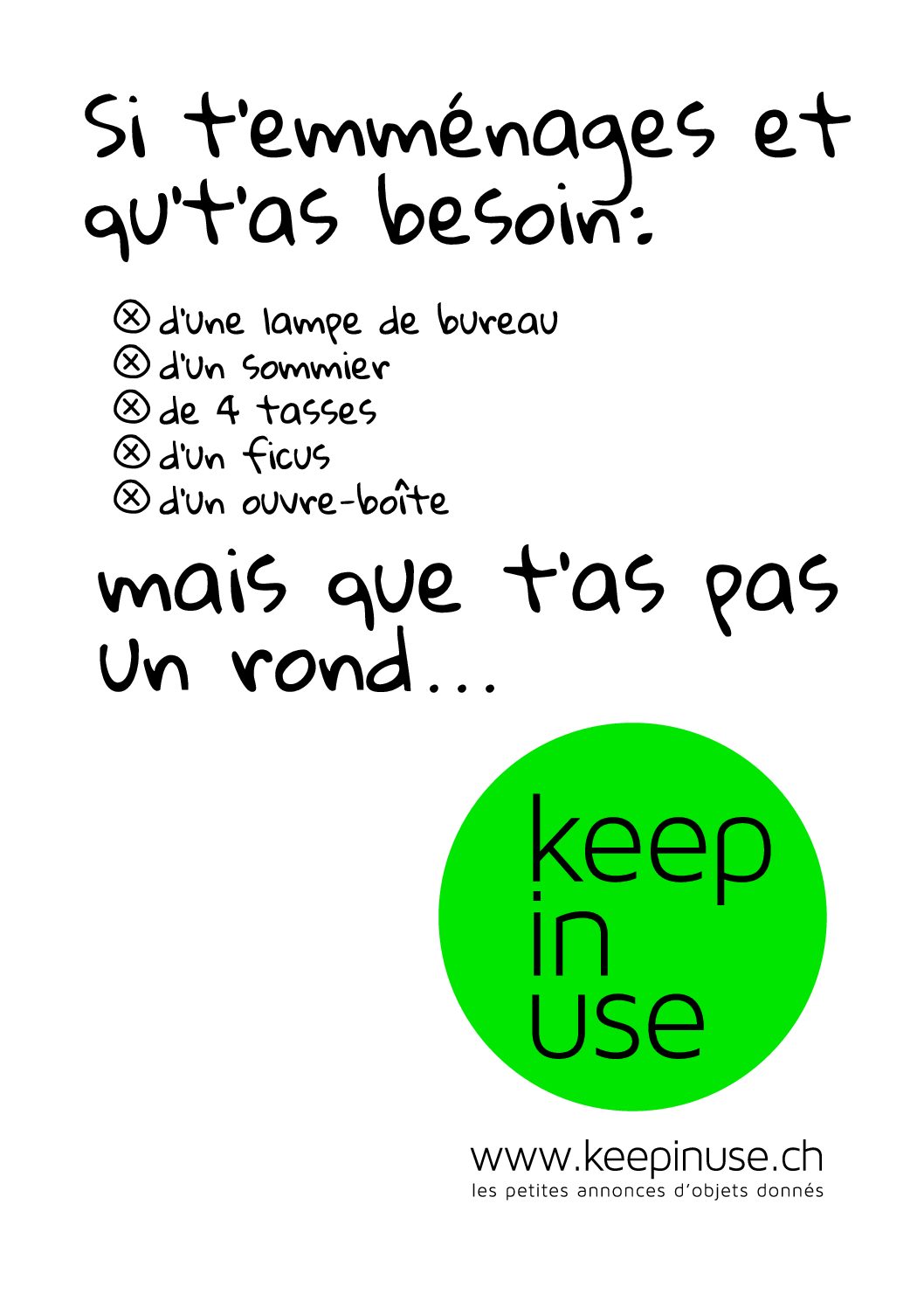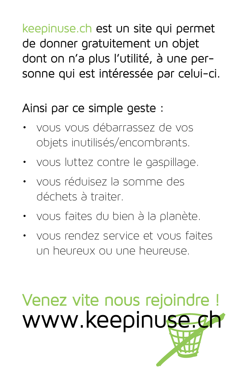 Je t’écris pour te parler d’un site sympa. Il s’appelle « Keepinuse » et tu le trouves à l’adresse suivante : www.keepinuse.ch ! Tu connais ?